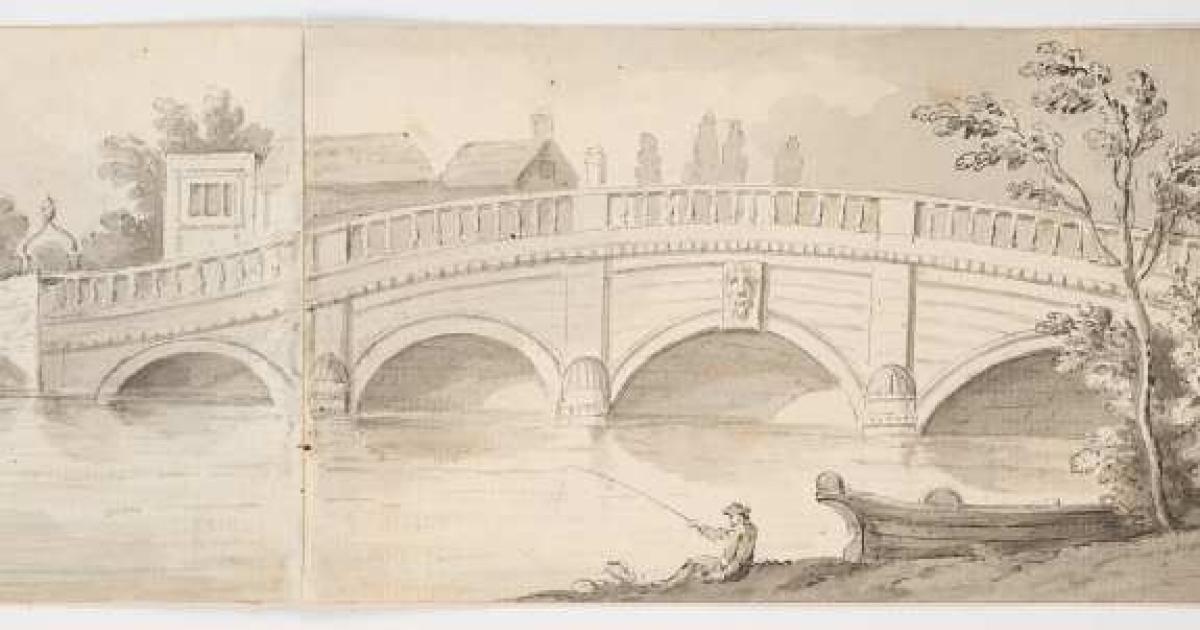 The painting is inscribed and dated “Henley Bridge Augst 4th 1814”, on the lower left and on the reverse is a sketch of a large house in a parkland in pen and ink and grey wash, on two sheets of joined laid paper possibly from a sketchbook.