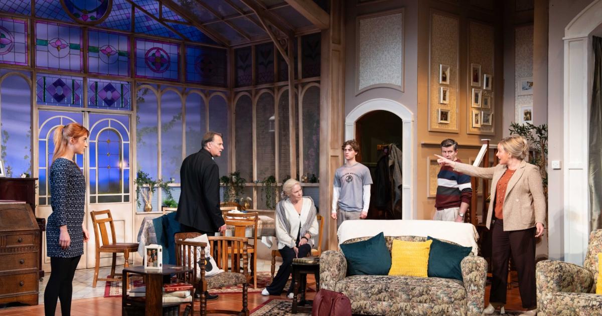 The set shows a spacious room backed by a stylish atrium with stained glass, French windows, trailing vines and comfortable seats for uncomfortable conversations.