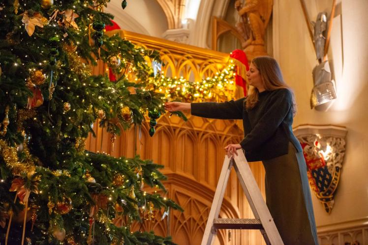 In the Crimson Drawing Room, one of the Semi-State Rooms which is only open in the winter months, stands a 16-foot-high Christmas tree.
